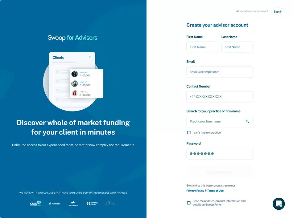 Disclaimer: Swoop Finance helps UK firms access business finance, working directly with businesses and their trusted advisors. We are a credit broker and do not provide loans or other finance products ourselves. We can introduce you to a panel of lenders, equity funds and grant agencies. Whichever lender you choose we may receive commission from them (either a fixed fee of fixed % of the amount you receive) and different lenders pay different rates. For certain lenders, we do have influence over the interest rate, and this can impact the amount you pay under the agreement. All finance and quotes are subject to status and income. Applicants must be aged 18 and over and terms and conditions apply. Guarantees and Indemnities may be required. Swoop Finance can introduce applicants to a number of providers based on the applicants’ circumstances and creditworthiness. Swoop Finance Limited is registered with the Financial Conduct Authority as an Account Information Services Provider (reference number 833145). Swoop Finance Limited is authorised as a credit broker under FCA registration number 936513. If you feel you have a complaint, please read our complaints section highlighted above and also contained within our terms and conditions. Swoop Finance Ltd is registered with Companies House (company number 11163382, registered address The Stable Yard, Vicarage Road, Stony Stratford, Milton Keynes MK11 1BN). VAT number: 300080279