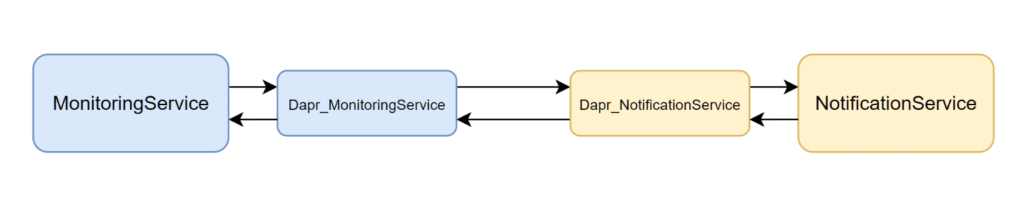 When MonitoringService finds a spike of activity, it will communicate with its own Dapr sidecar Dapr_MonitoringService, telling it that it needs to fire off a notification.