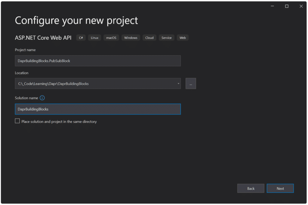 Next, let’s name our solution DaprBuildingBlocks and our project DaprBuildingBlocks.PubSubBlock