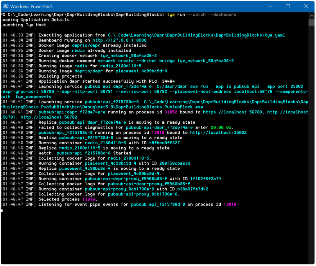 Open a PowerShell window here at the root and execute the command tye run –watch –dashboard.