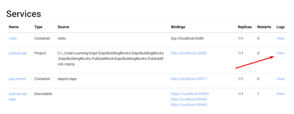 Once you do receive a status code 200 response, let’s go back to the tye dashboard to view the logs of our application.