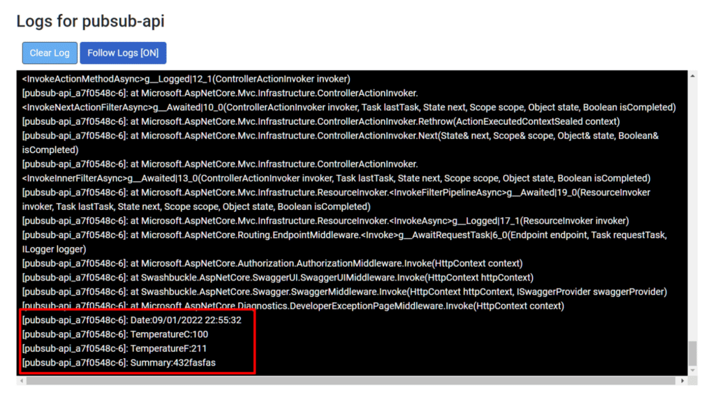 And there we have it… the message that we published to the forecast topic was received by the controller action that was subscribed to that very topic, the controller action was invoked and the message was printed to the console, reflected in the logs we see here.