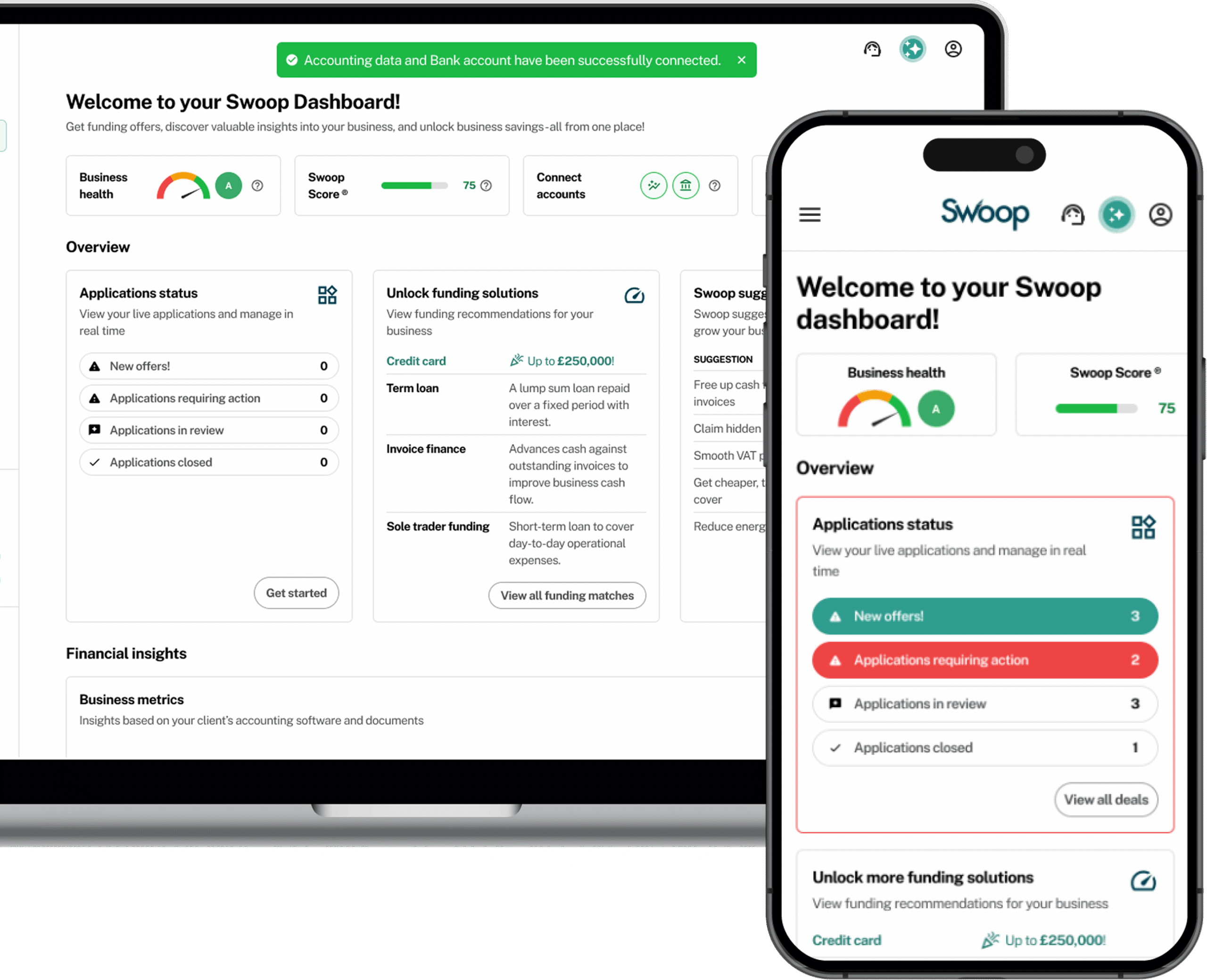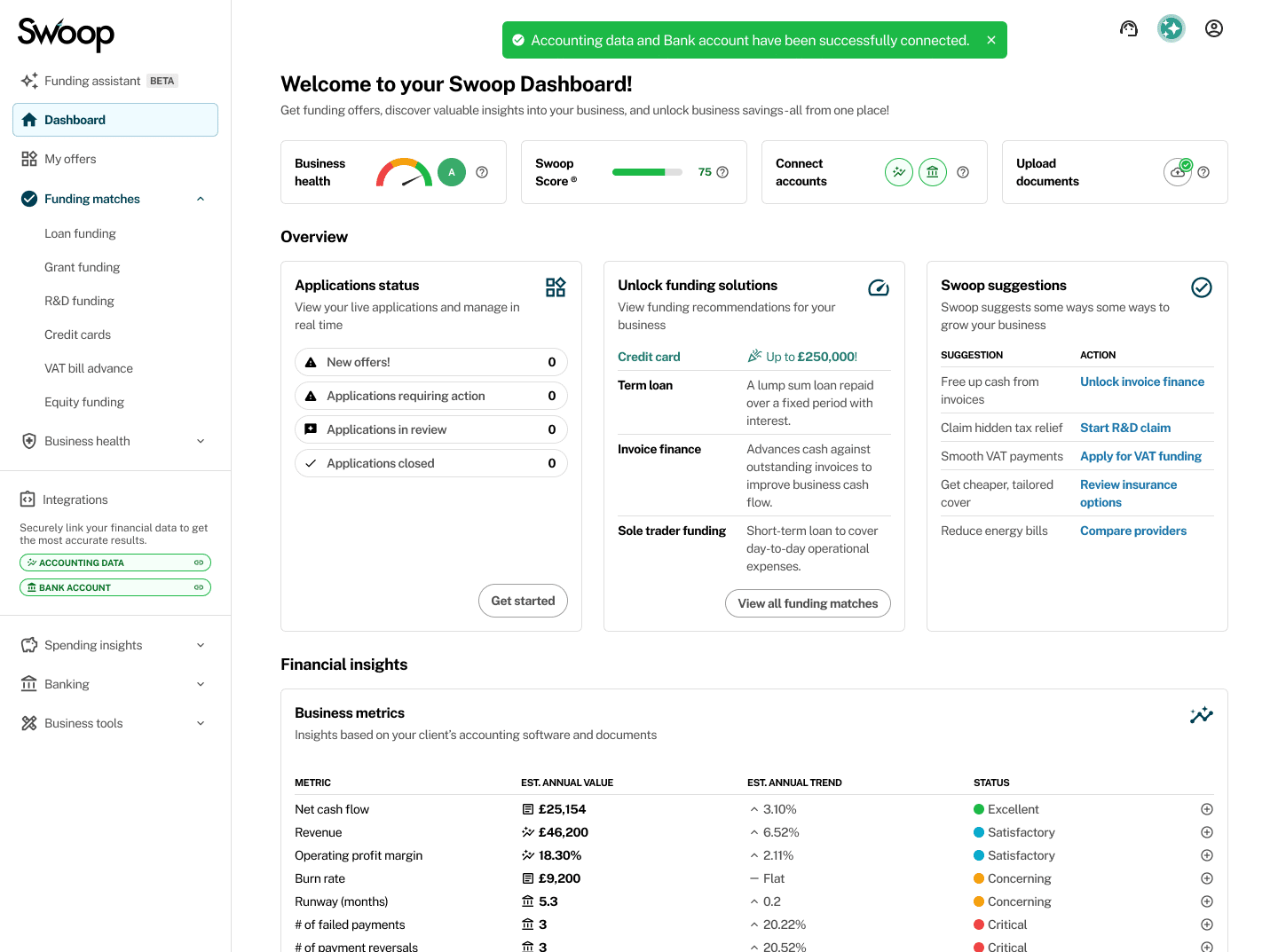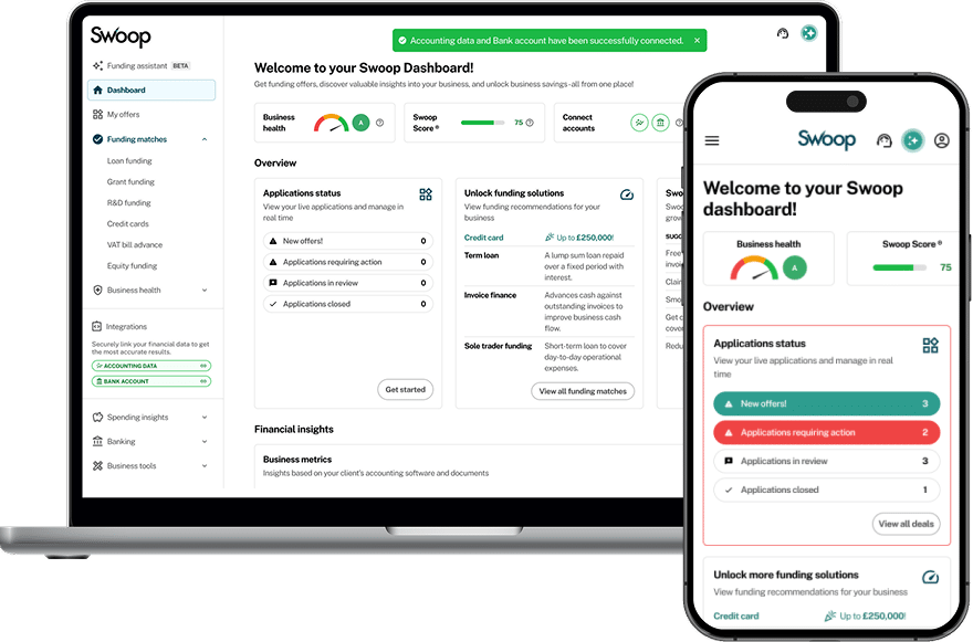 Swoop Finance Limited helps UK firms access business finance by working directly with businesses and their trusted advisors. We act as a credit broker, not a lender, and do not provide loans or finance products ourselves. We introduce applicants to a panel of lenders, equity funds, and grant agencies based on individual circumstances and creditworthiness.